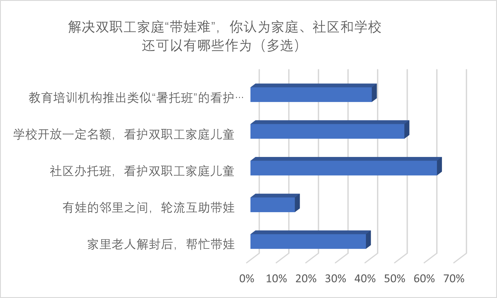除了希望企业能够更无邪人性化的思量职工带娃现实难题,,,,不少受访者以为社区、学校、家庭等多方面起劲,,,,配合解决这一难题。。。。