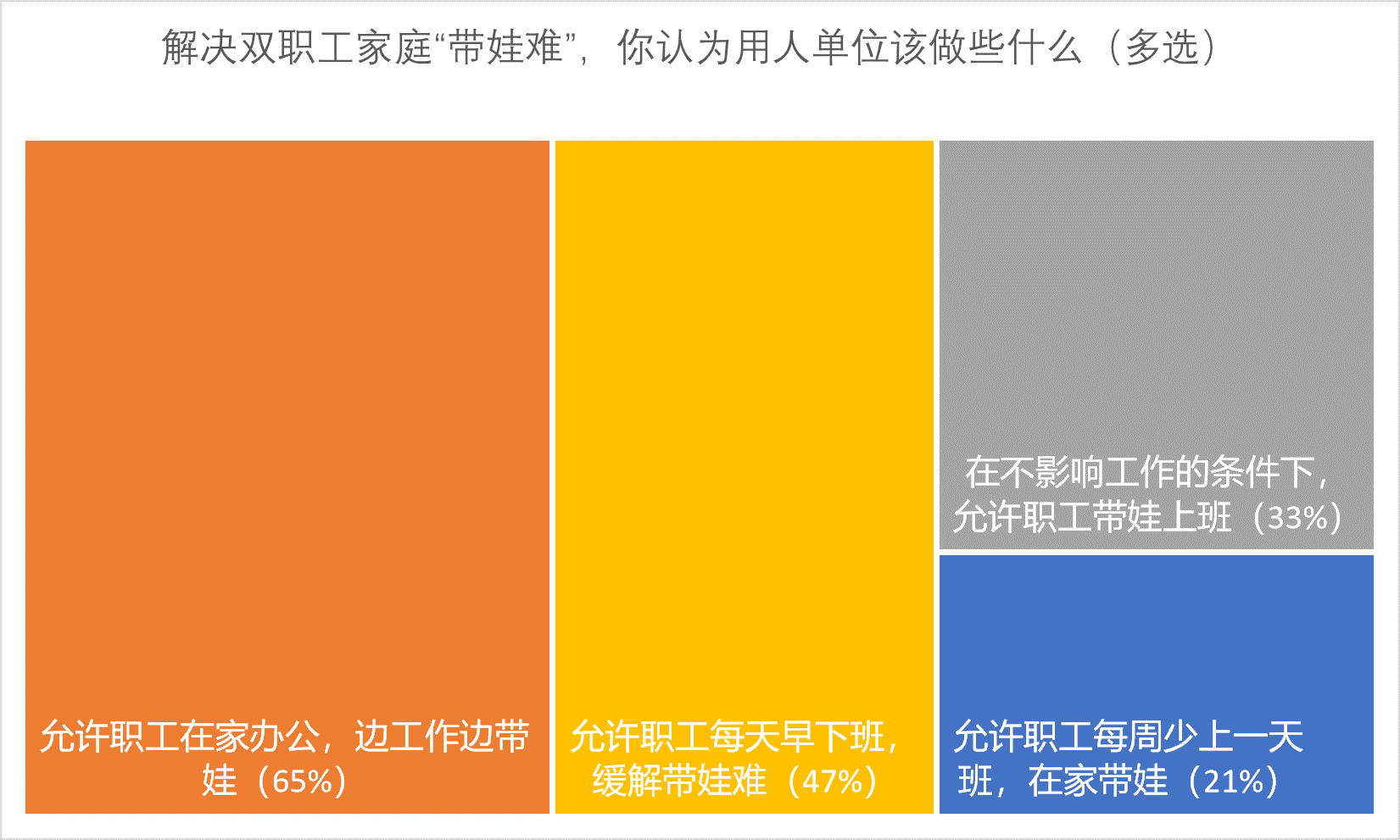 好比,,,,在“复工复产后,,,,你以为解决双职工家庭‘带娃难’,,,,用人单位该做些什么????”这一投票中,,,,65%的受访者希望“单位能够允许职工在家办公,,,,边办公边带娃”;;;;;;47%的网友希望企业“允许职工天天早下班,,,,缓解带娃难”;;;;;;尚有33%的网友希望“在不影响事情的条件下,,,,允许职工带娃上班”。。。。别的,,,,尚有21%的网友希望单位能够“允许职工可以每周少上一天班,,,,在家带娃”。。。。