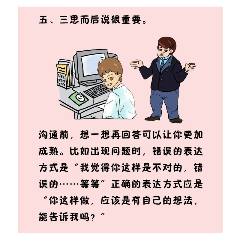 相同前,,,,想一想再回覆可以让你越发成熟。。。。。。。好比泛起问题时,,,,过失的表达方法是“我以为你这样是差池的,,,,过失的……等等”准确的表达方法应是“你这样做,,,,应该是有自己的想法,,,,能告诉我吗??????”