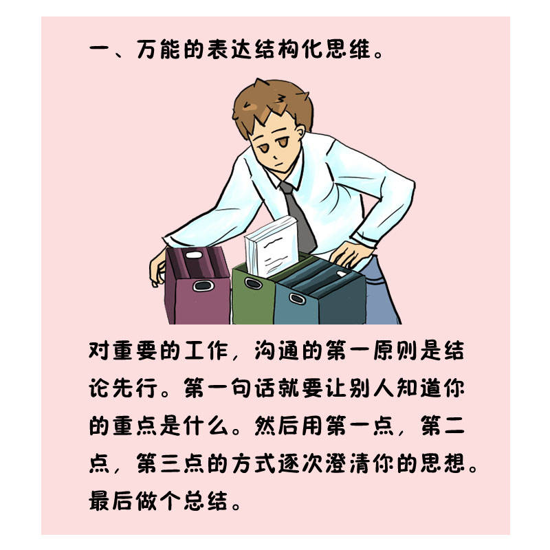 对主要的事情,,,,相同的第一原则是结论先行。。。。。。。第一句话就要让别人知道你的重点是什么。。。。。。。然后用第一点,,,,第二点,,,,第三点的方法逐次澄清你的头脑。。。。。。。最后做个总结。。。。。。。