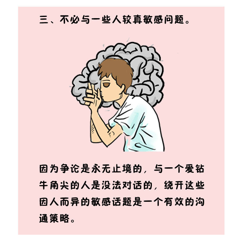 由于争论是永无止境的,,,,与一个爱钻牛角尖的人是没法对话的,,,,绕开这些因人而异的敏感话题是一个有用的相同战略。。。。。。。