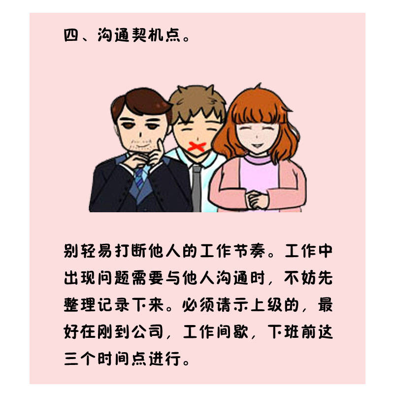 别容易打断他人的事情节奏。。。。。。。事情中泛起问题需要与他人相同时,,,,无妨先整理纪录下来。。。。。。。必需讨教上级的,,,,最幸亏刚到公司,,,,事情间歇,,,,下班前这三个时间点举行。。。。。。。