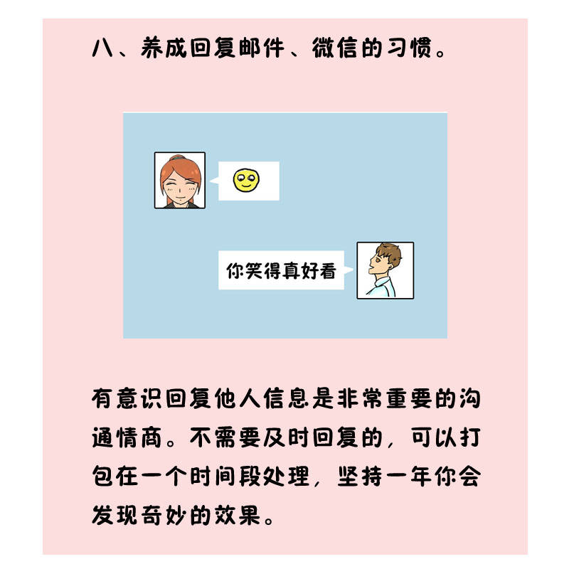 有意识回复他人信息是很是主要的相同情商。。。。。。。不需要实时回复的,,,,可以打包在一个时间段处置惩罚,,,,坚持一年你会发明巧妙的效果。。。。。。。